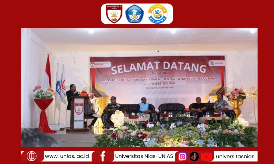 Universitas Nias. ac.id-Gunungsitoli : Universitas Nias memperoleh kehormatan atas kunjungan Konsul Jenderal India Yang Mulia H.E. Mr. Ravi Shanker Goel, bersama Kepala LLDikti Wilayah I Sumatera Utara, Prof. Saiful Anwar Matondang, M.A., Ph.D. Kegiatan yang berlangsung di Aula Universitas Nias, Jalan Yosudarso. No 118 E/S Kota Gunungsitoli. Selasa 28 Oktober 2025. Kegiatan tersebut menjadi momentum penting dalam memperkuat hubungan bilateral Indonesia–India, khususnya di bidang pendidikan tinggi, penelitian, dan pertukaran budaya.