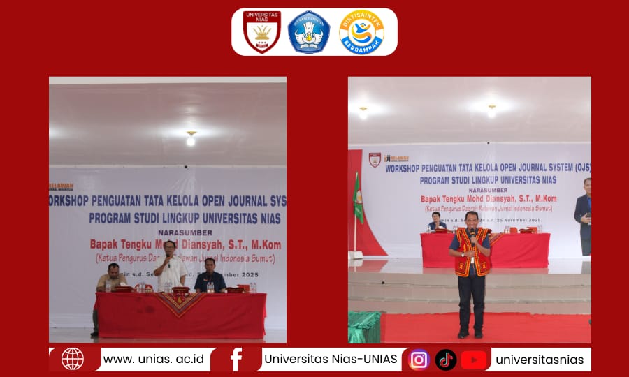 Universitas Nias.ac.id. Gunungsitoli: Universitas Nias menyelenggarakan Workshop Pengelolaan Open Journal System (OJS) sebagai upaya meningkatkan kompetensi para pengelola jurnal di lingkungan kampus. Kegiatan yang berlangsung mulai dari Senin-Selasa. 24 s.d 25 November 2025 bertempat di Aula Universitas Nias, Jl. Yos Sudarso No. 118 E/S Kota Gunungsitoli. Kegiatan ini diikuti oleh para Wakil Rektor, Dekan lingkup Universitas Nias, Kepala Lembaga, Biro, Ketua Program Studi dan Sekretaris, Tim Pengelola Jurnal Program Studi Lingkup Universitas Nias.